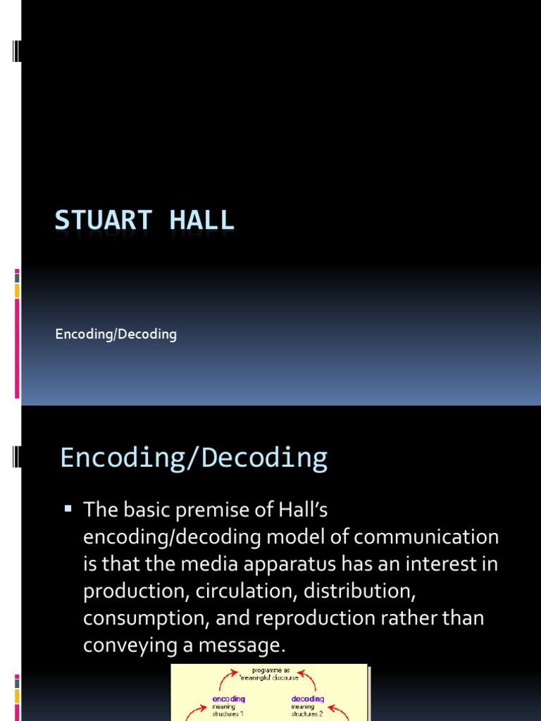 Stuart Hall ENCODING DECODING EDITORS INTRODUCTION STUART HALLS INFLUENTIAL ESSAY offers a densely theoretical account of how messages are produced and disseminated referring particularly to television. Peirces theory of the interpreter and interpretant. Stuart Hall ENCODING DECODING EDITORS INTRODUCTION TUART HALLS INFLU ENTIAL essay offers a densely theoretical account of how messages are produced and disseminated referring particu- larly to television.